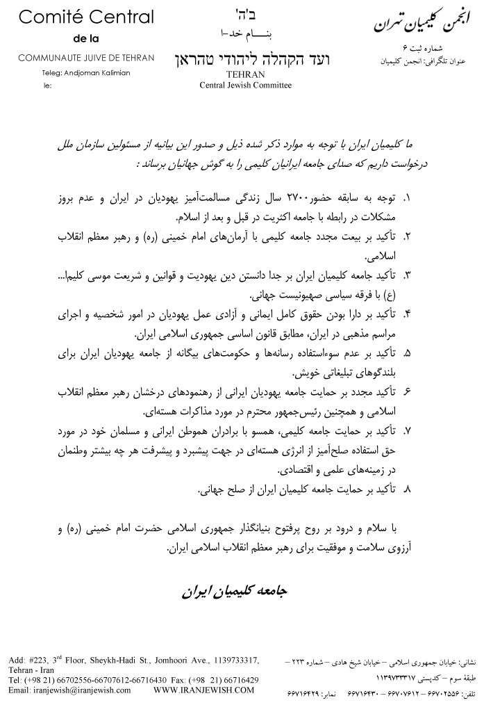 بیانیه انجمن کلیمیان در راستای حمایت از نظام و دولت جمهوری اسلامی
