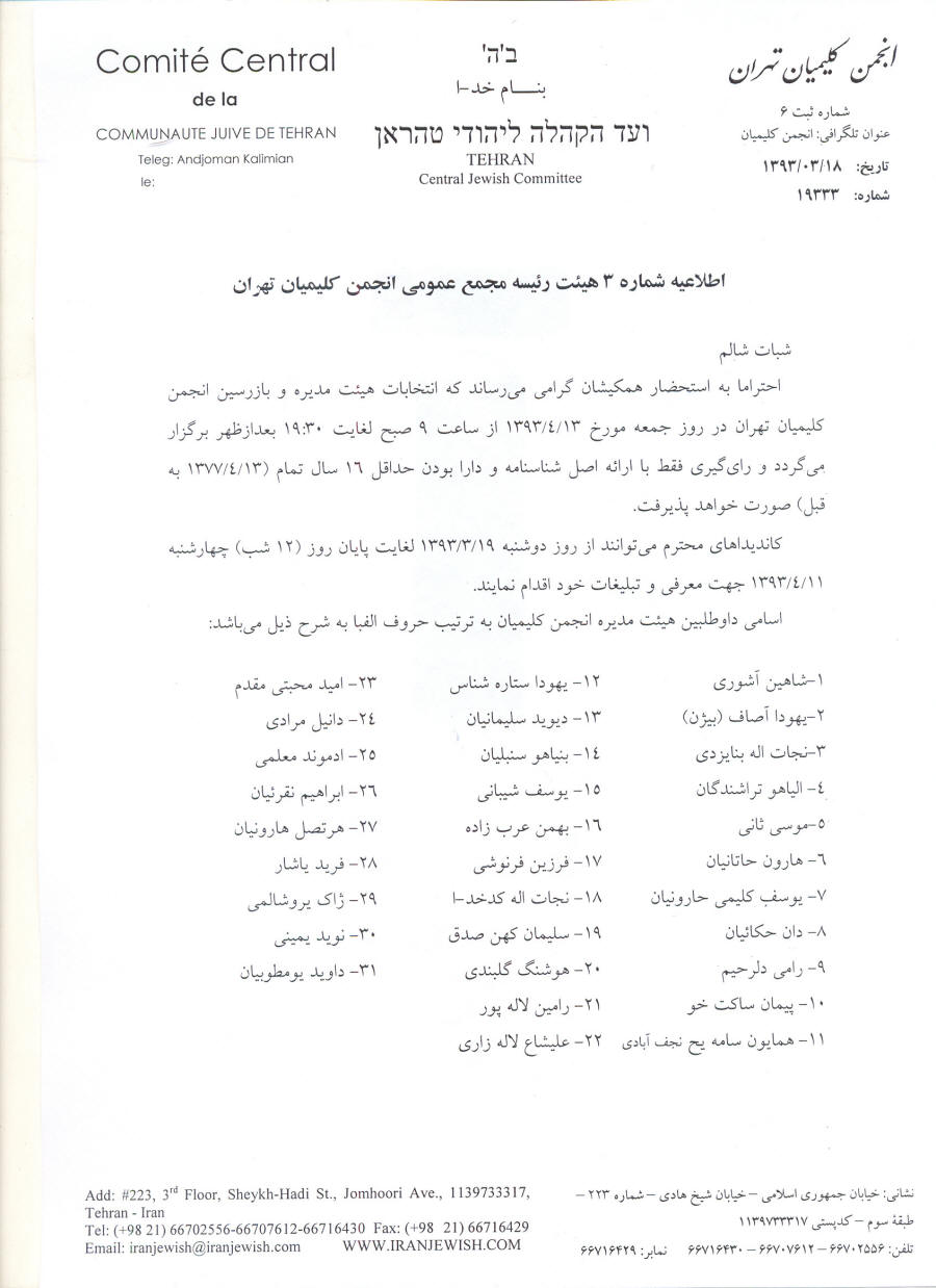 اطلاعیه شماره 3 هیئت رئیسه مجمع عمومی انجمن کلیمیان تهران اسامی داوطلبین