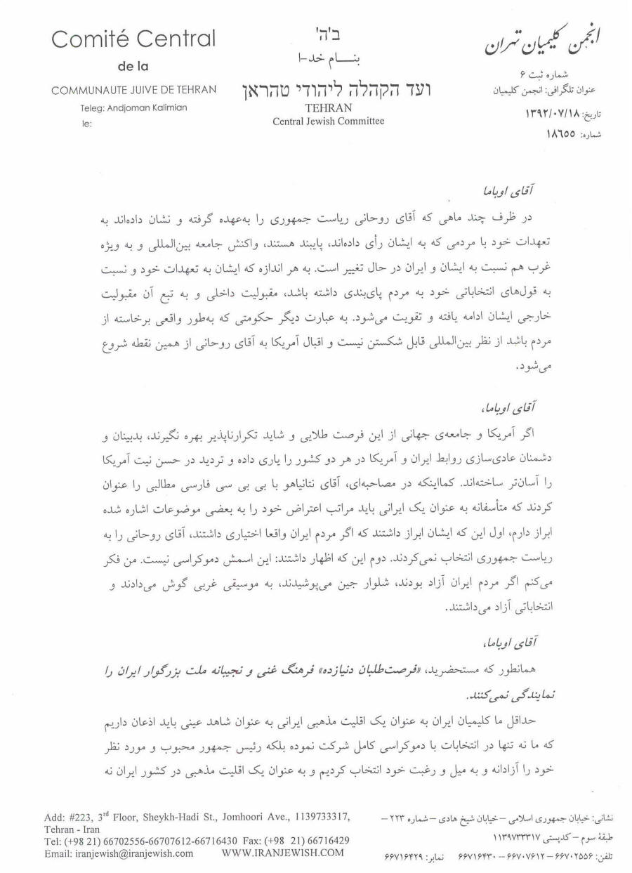 نامه رییس انجمن کلیمیان تهران در حمایت از دولت روحانی و اعتراض به سخنان نتنیاهو
