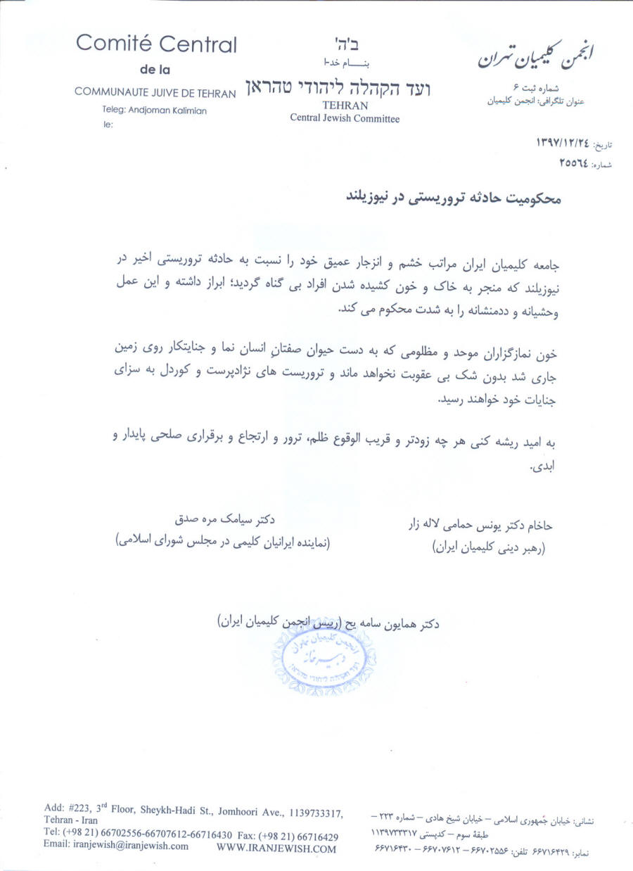 جامعه کلیمیان ایران مراتب خشم و انزجار عمیق خود را نسبت به حادثه تروریستی اخیر