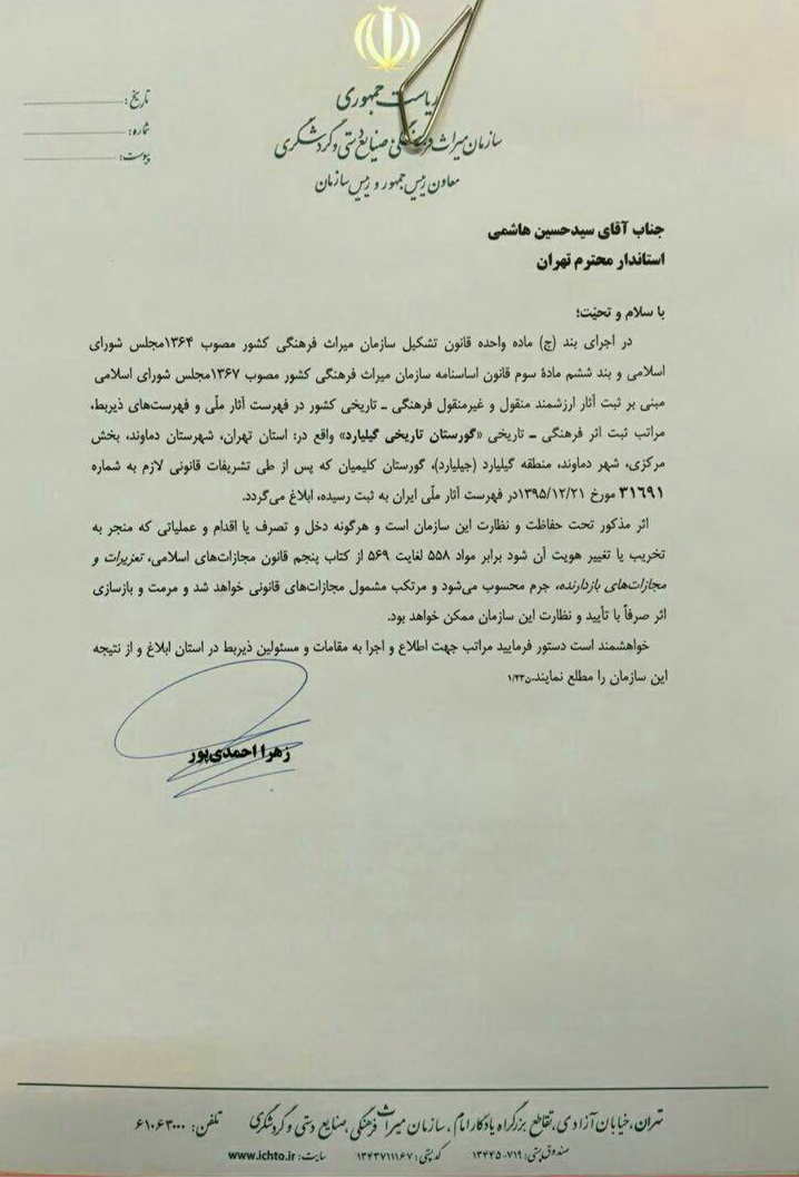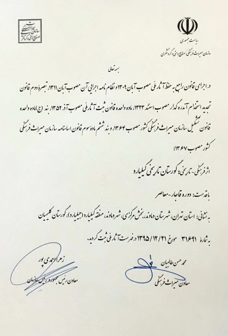 آرامستان تاریخی گیلیارد دماوند به شماره 31691 در تاریخ 21 اسفند 1395توسط سازمان میراث فرهنگی به ثبت آثار ملی ایران رسیده و به زودی مراحل تعیین حدود، دیوارکشی و بازسازی قبور و صیانت از آن با همکاری میراث فرهنگی و انجمن کلیمیان تهران شروع خواهد شد. این گورستان تاریخی با قدمتی باستانی، از اولین مراکز یهودی‌نشین، پس از ورود یهودیان به ایران بوده که آثار متعددی از تمدن اسلامی را نیز در خود جای داده است. 