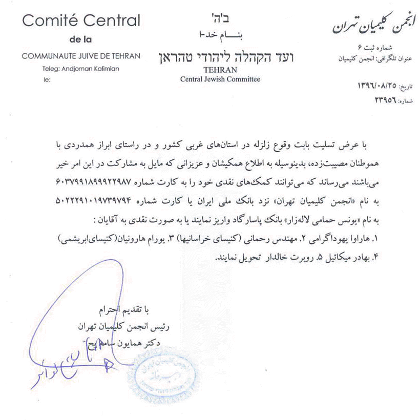عمومی انجمن کلیمیان تهران، مراتب عمیق تسليت و همدردي خود را بابت زلزله پیش آمده