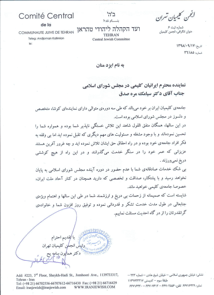 تبریک به نماینده منتخب ایرانیان کلیمی در مجلس شورای اسلامی