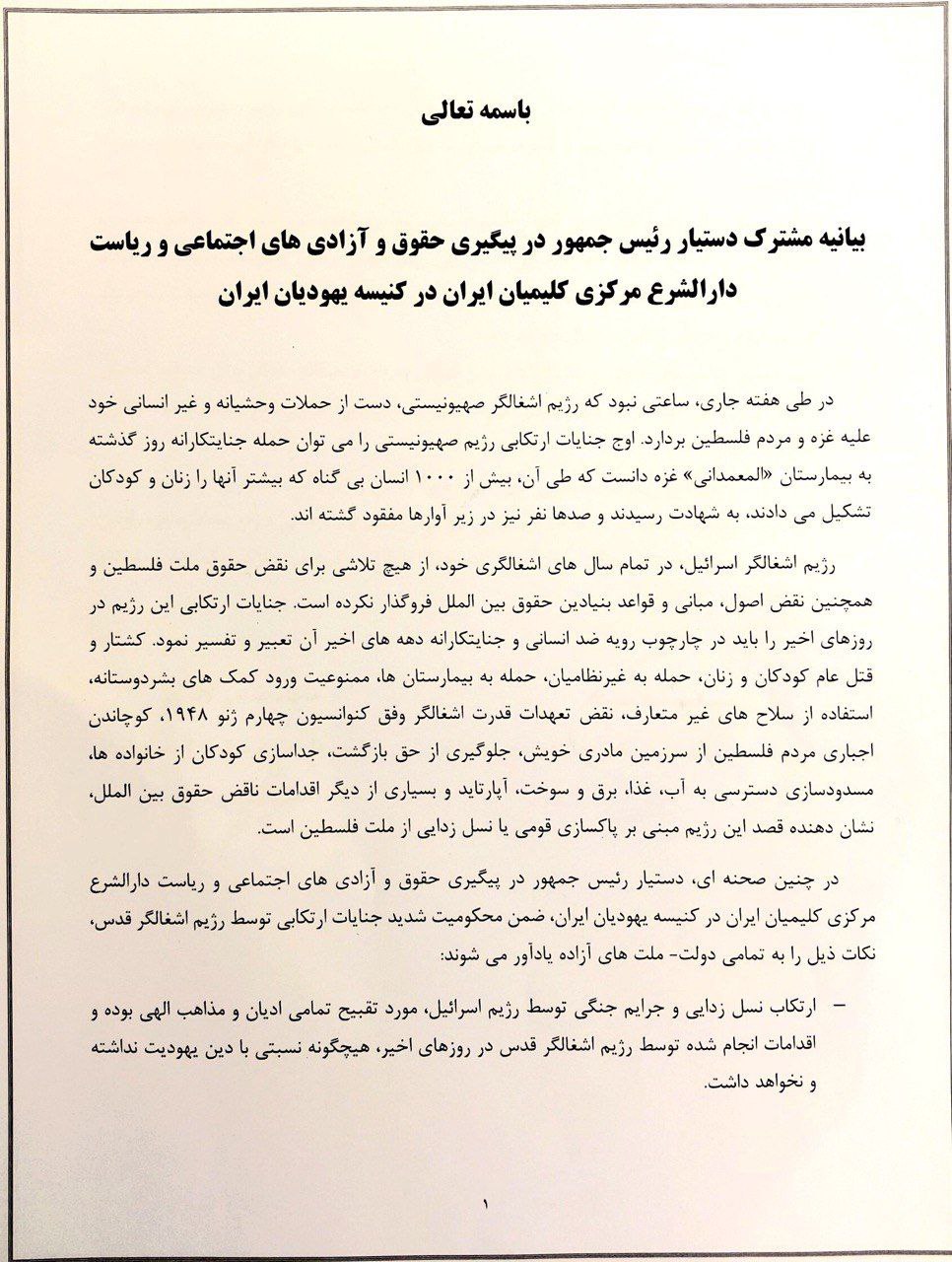 بیانیه ی نماینده ی کلیمیان: جامعه ی ایرانیان کلیمی کشتار بی رحمانه ی رژیم غاصب و کودک کش صهیونیستی در