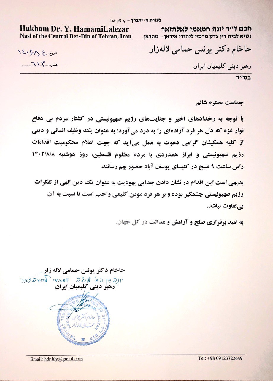 کنیسه ی یوسف آباد تهران درباره ی حملات اخیر رژیم صهیونیستی به مردم غیرنظامی