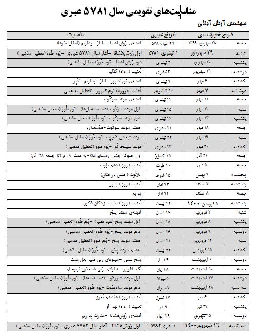 شنبه 29 شهریور 1 تیشری 5781 اول رُوش‌هَشانا –آغاز سال 5781 عبری – یُوم طُووْ (تعطیل مذهبی)